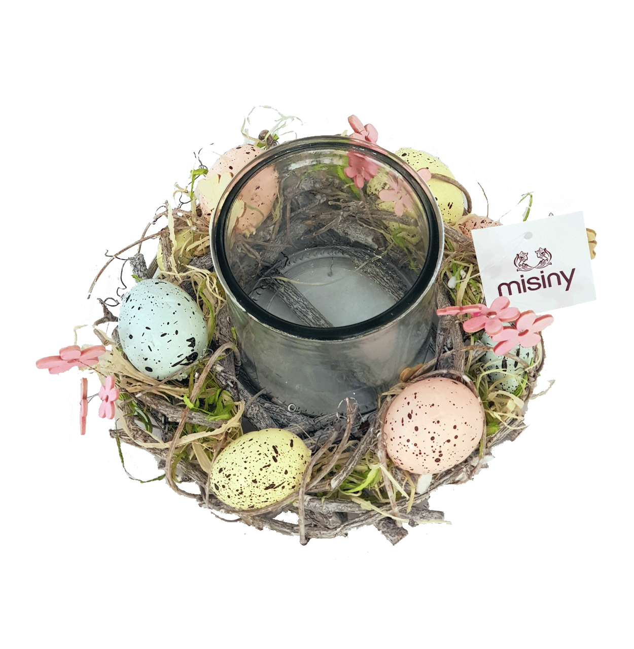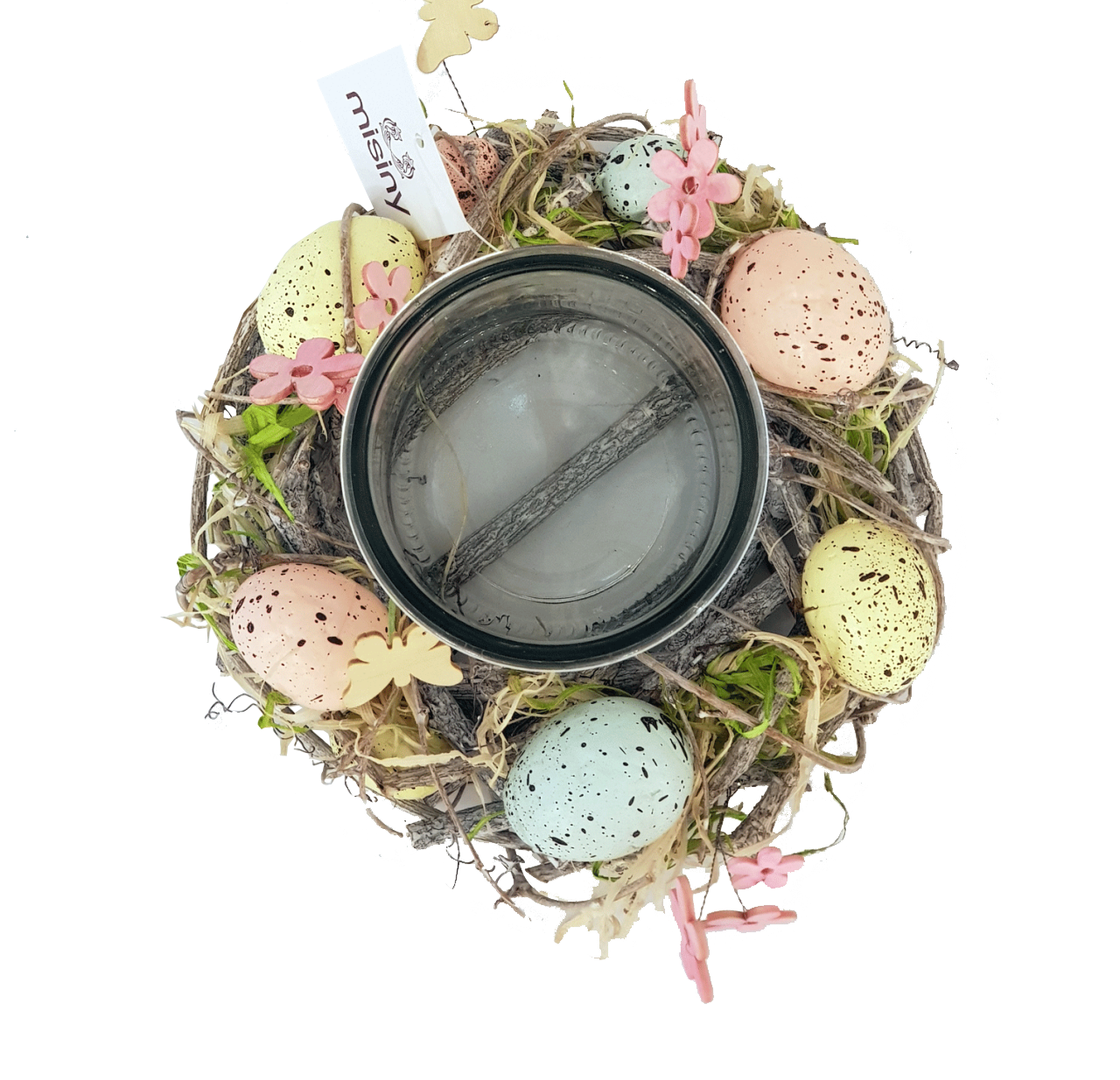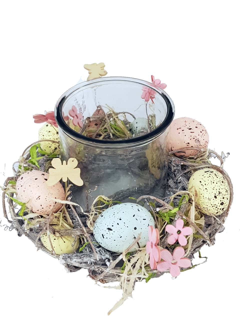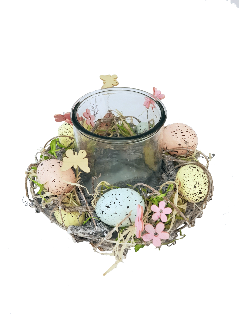 AĞAÇ VE DOĞAL MATERYALLERDEN YAPILMIŞ CAM MUMLUK.